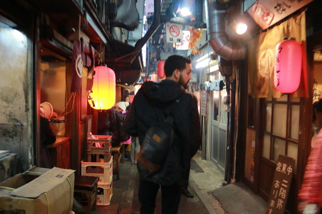 Photos on the streets of the Golden Gai are prohibited, but the architecture and density of this alley of restaurants (also in Shinjuku) is comparable.The first stop was a really chill bar that only sat 6 people near the Robot Restaurant. Half of the group was eating ramen across the street and there were only a couple of seats free, so we got a bottle of hot sake and those who weren't eating rotated in and out until we finished it. Once we finished, it was time for a proper nomikai. We headed to Shinjuku's Golden Gai, an area with over 200 tiny eccentric bars that fit between 6 and 20 people max. Since this was the first time the majority of us were together, we had some trouble finding a place that would be able to seat us all but we lucked out at a bar called ロンリー (Lonely).
